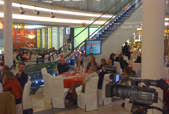 - 7 hochwertige LCD Displays auf Hochständer um die Redner in verschiedene Bereiche des Centers zu übertragen